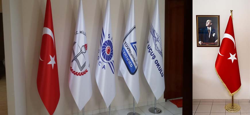 Milli Eğitim Bakanlığına bağlı okullar, kurum ve kuruluşlar için MEB Standartlarında okul flamaları Saten kumaştan üretilir.